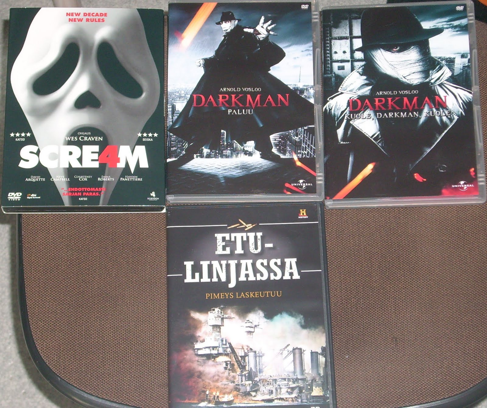 Poimin Anttilan sivuilta muutaman tulevan leffaostoksen mistä ainakin huomenissa voisin poimia muutaman valitun. -Ainakin kuvassa näkyvät Darkman jatko-osat ovat aika vahvoilla. -Vaikka ykkös Darkman ei ollutkaan mitään parasta laatua -pitäähän nyt jatko-osat kuitenkin hankkia rinnalle. -Niistä on odotettavissa vielä karseampaa..., mutta kokoelman tähden hankittava. -Uutuusleffoista onkin hankalampi päättää. -Tuo vasemmassa yläkulmassa koreileva Fast Five tuli katsottua lentokoneessa uudestaan -kerran oli mahdollista katsoa -niin ehkä se saa hieman odottaa ostamistaan. -Battle Los Angeles voisi menneen matkan kunniaksi olla yksi uutuusleffa huomenna poimittavaksi. -Enpä ahtanut kuvaan kaikkia löytämiäni leffoja. -Voipi olla että mukaan lähtee jotain ei kuvassa näkevää. -Matka viikon aikana on saattanut kuitenkin tulla vaikka mitä kivaa Anttilan valikoimiin.